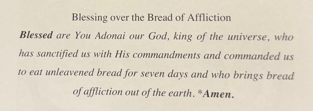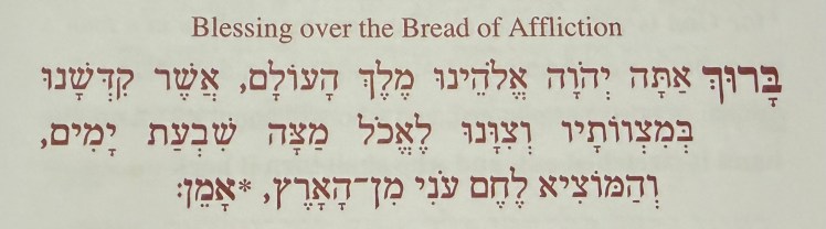 Karaite Jews have a special blessing for the Chag Hamtsot. The Hamotsi blessing is typically said over bread. The word “oniy” is inserted between the words “lechem” and “min.” Oniy means the “slaves” or the “afflicted”, essentially making the blessing for Matsa a blessing over the bread of affliction. The blessing thus goes: